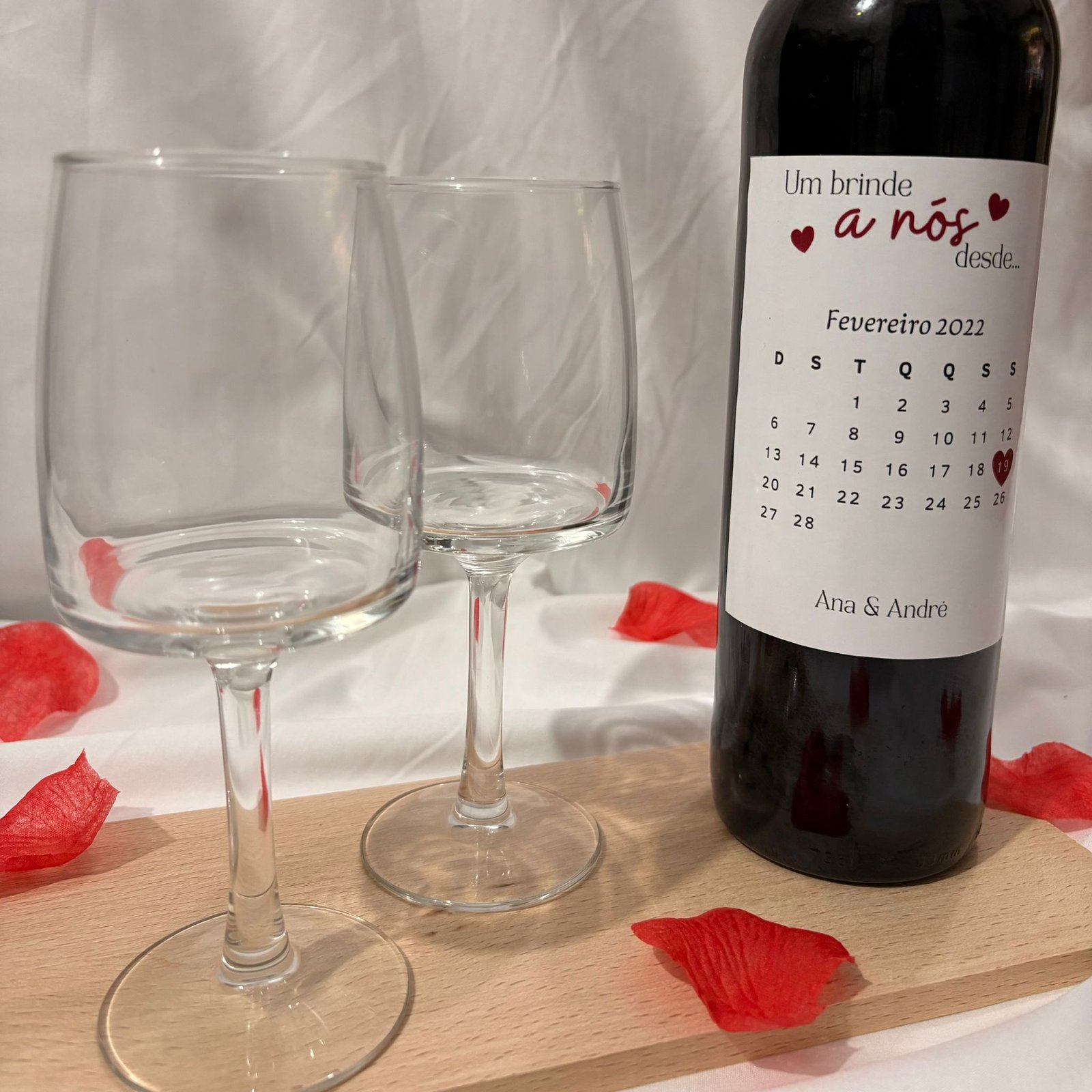 Celebre dias especiais com o nosso kit de Brinde Perfeito. Com 2 copos de pé alto que torna o momento mais elegante e com uma garrafa de vinho totalmente personalizada de forma a criar uma memória exclusiva e para a vida!